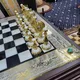 Корпус "Баталии" изготовлен из массива бука, усиленного мраморными вставками и лакированным долеритом. Декоративные элементы выполнены из полированной латуни, покрытой никелем и золотом, что придает набору блеск и элегантность. Внутри лабиринтного узора раскинулись шахматные фигуры, созданные с невероятным вниманием к деталям.